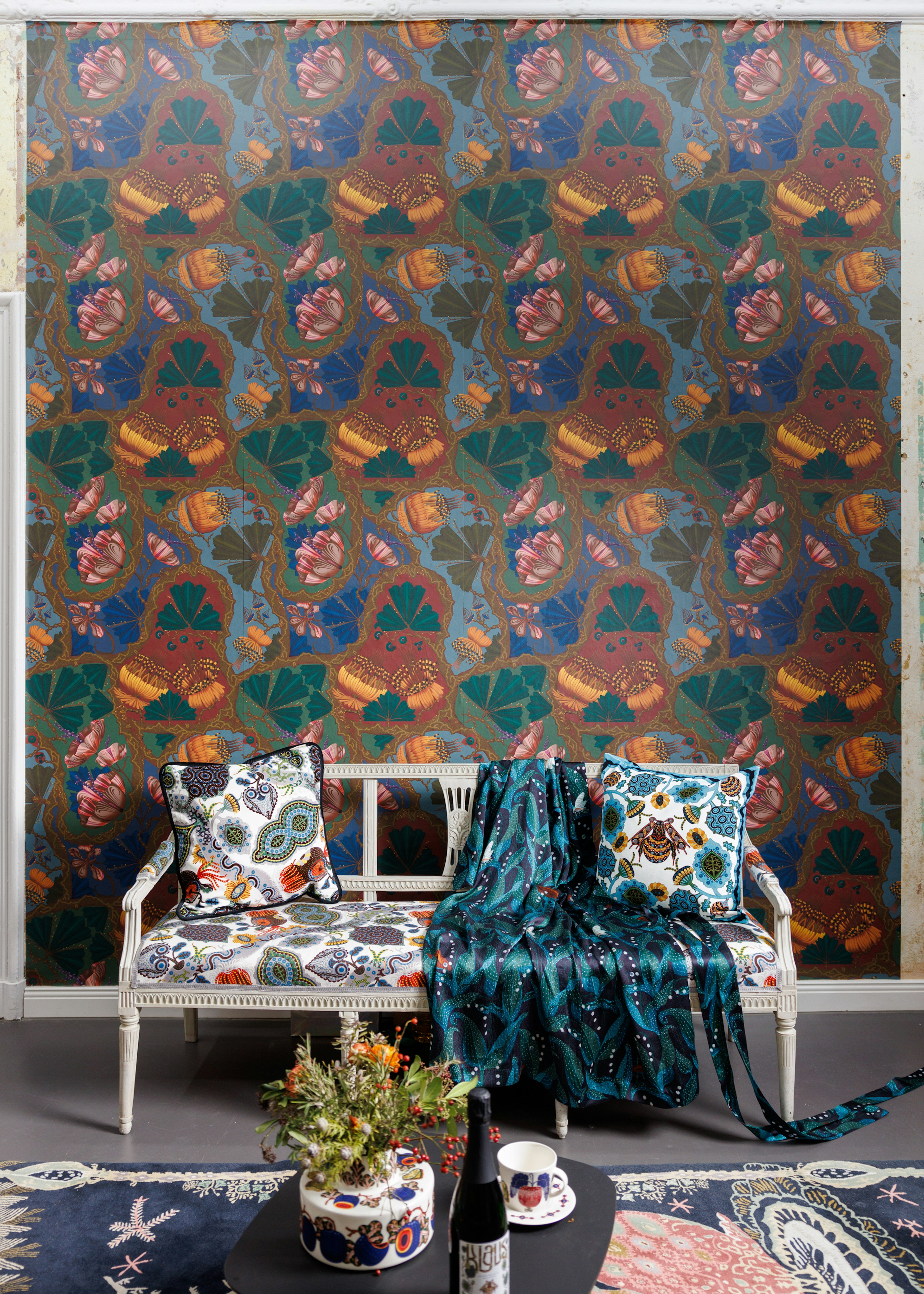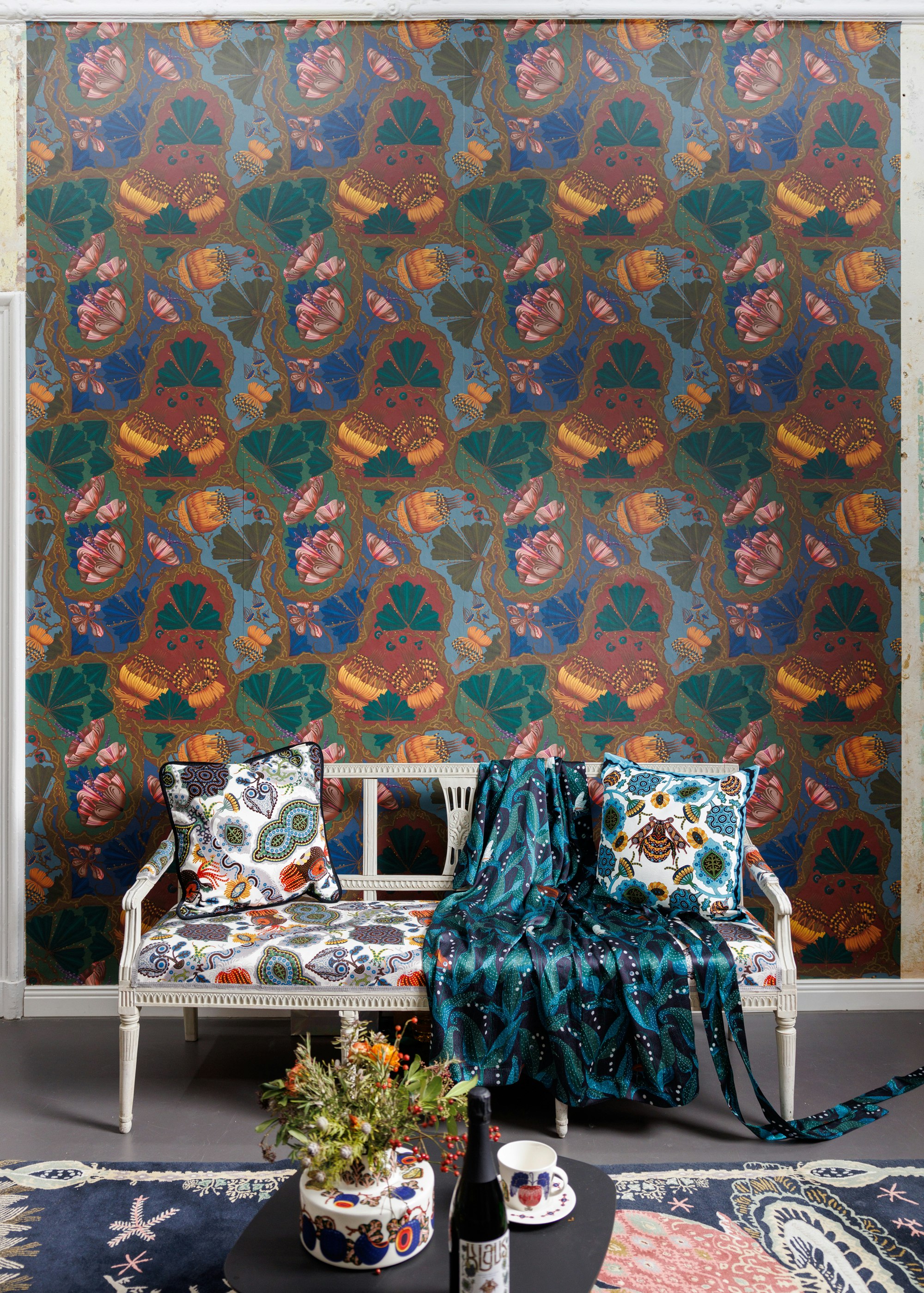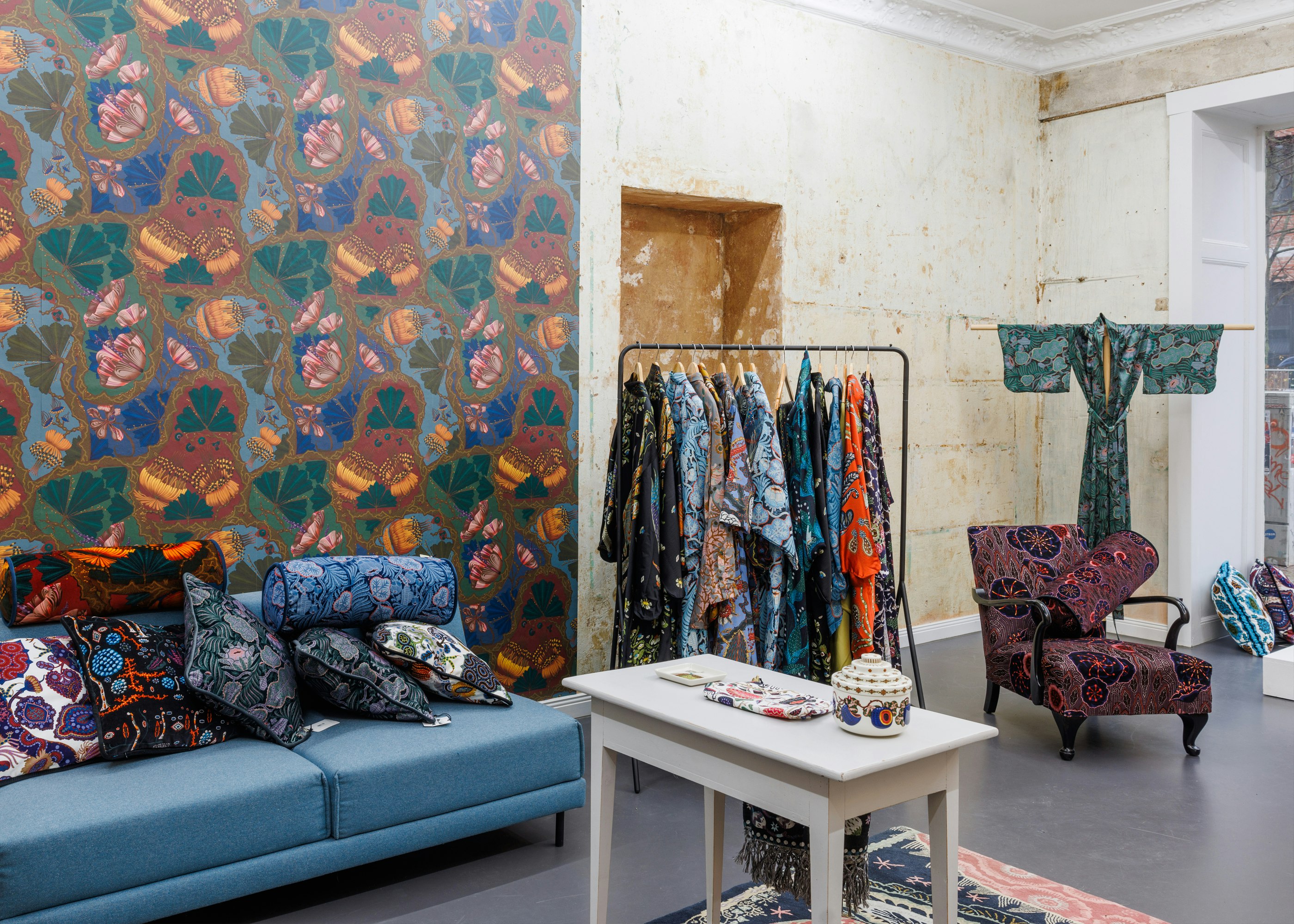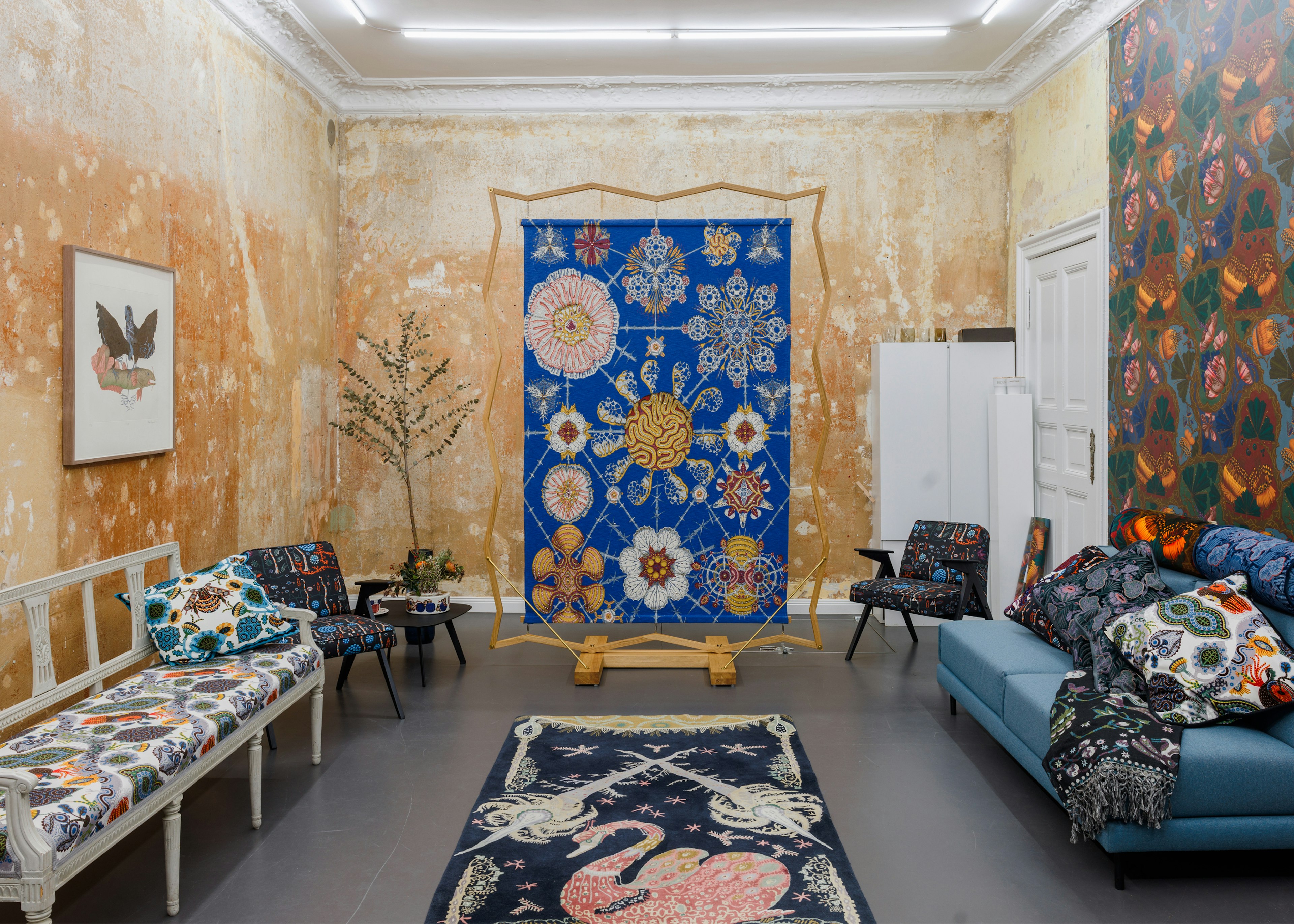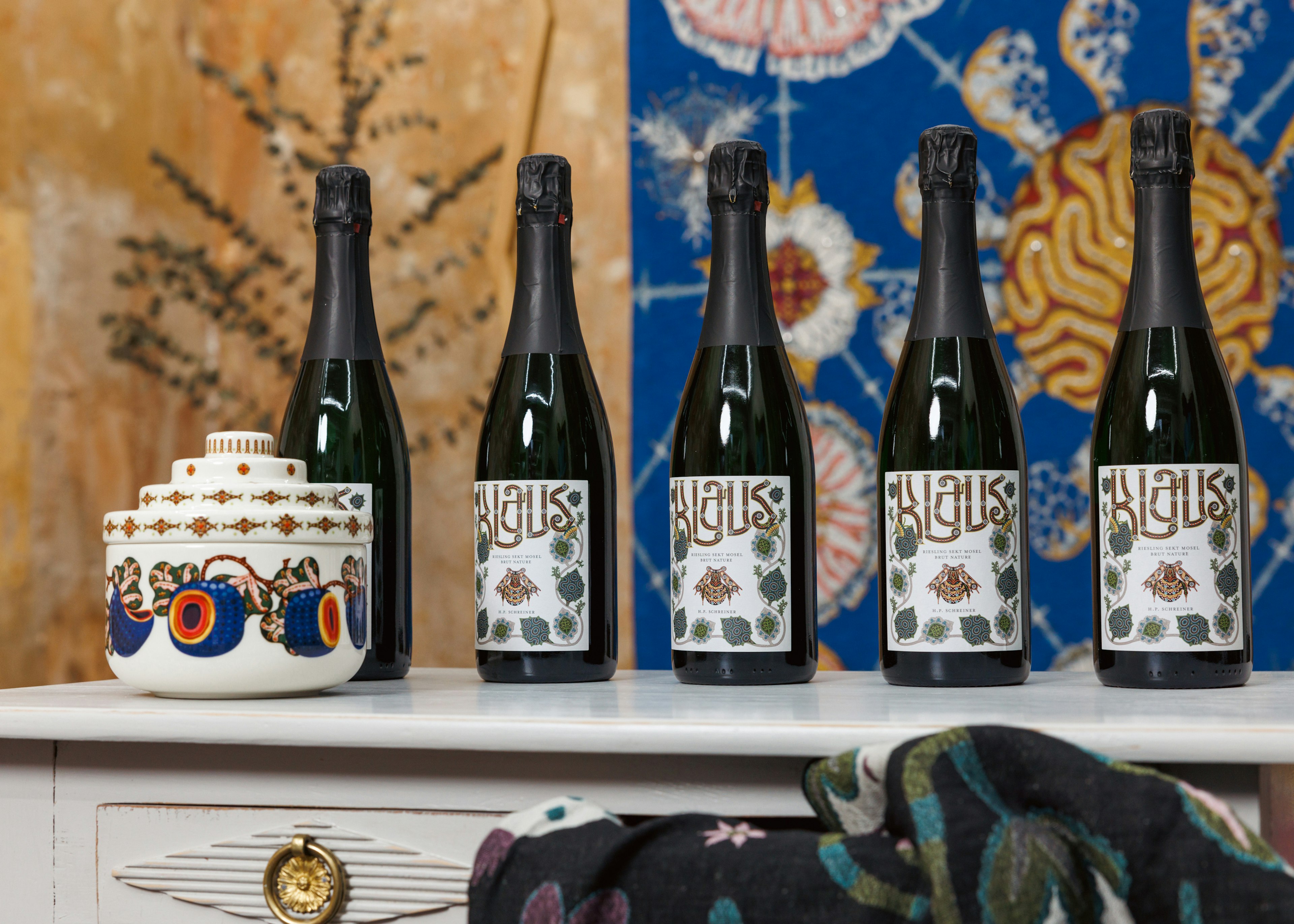 Studio 4 Berlin invited Klaus Haapaniemi & Co to present a showroom installation for the third time at their Charlottenburg location. Presenting unique tapestry, textiles, wallpaper, uphostered furniture, fashion and etchings in the atmospheric surroundings, with launch of new Klaus wine, in collaboration with H.P. Schreider.