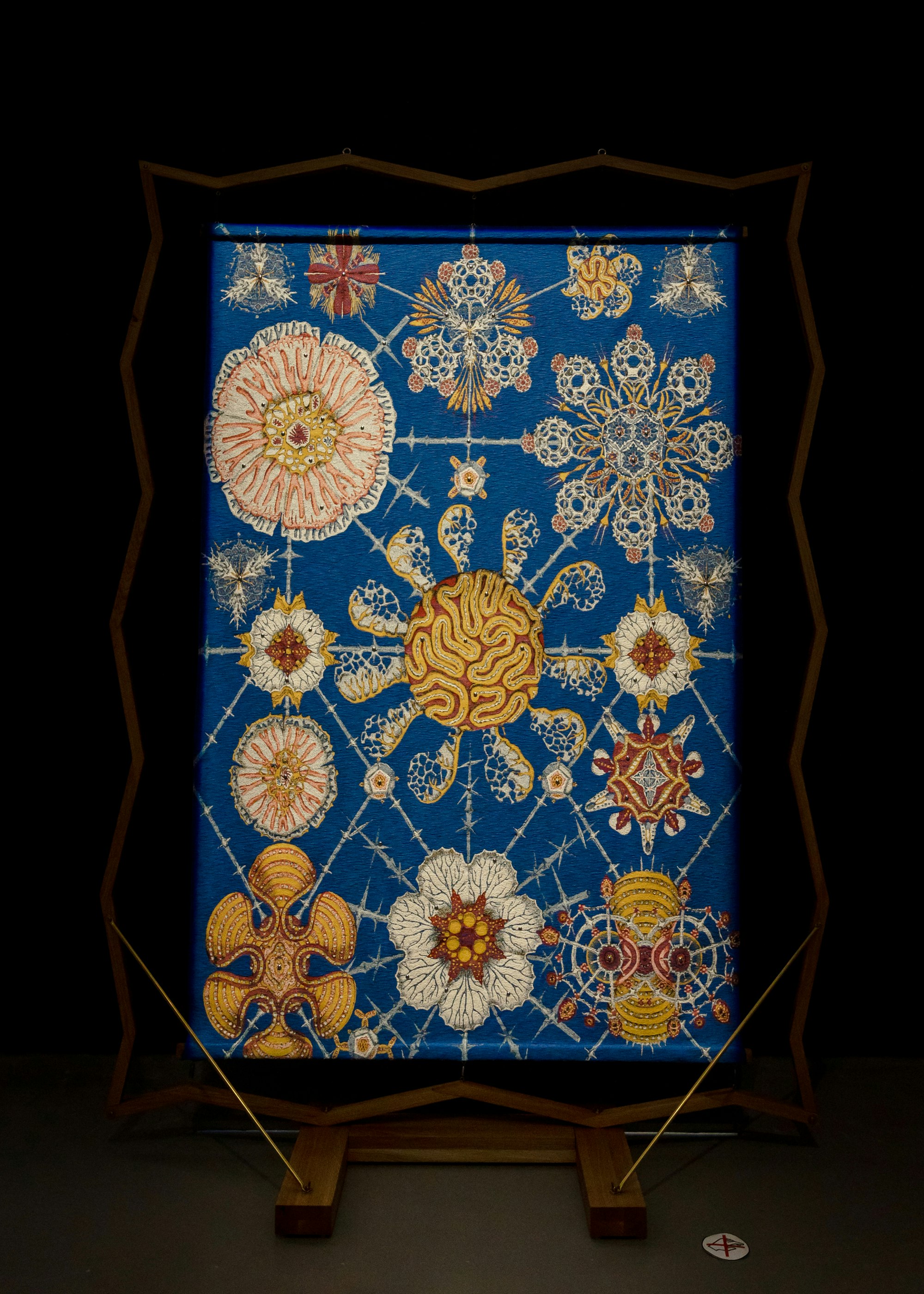 Woven in Belgium using the tapestry technique, the florals draw inspiration from herbal remedies, healing plants and flower motifs. The patterns of the textile works are unprecedented inHaapaniemi‘s works: in the fabrics produced for the exhibition, the metallic surface of the threads is combined with floral's own metallic color palette and geometric patterns. The wall hangings are attached to sculptural wooden frames, which were previewed at Klaus Haapaniemi's Berlin and Madrid exhibitions in 2022.