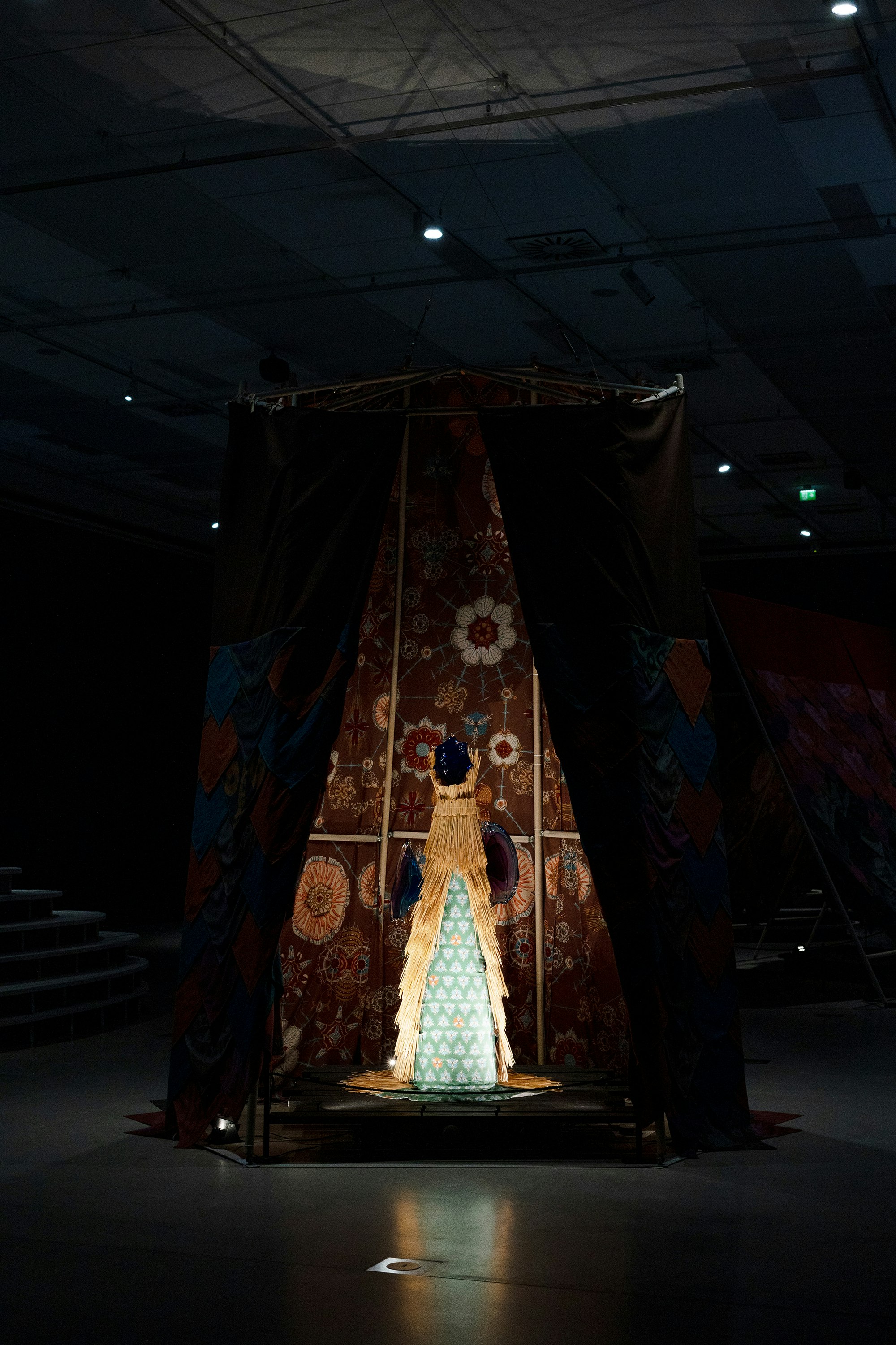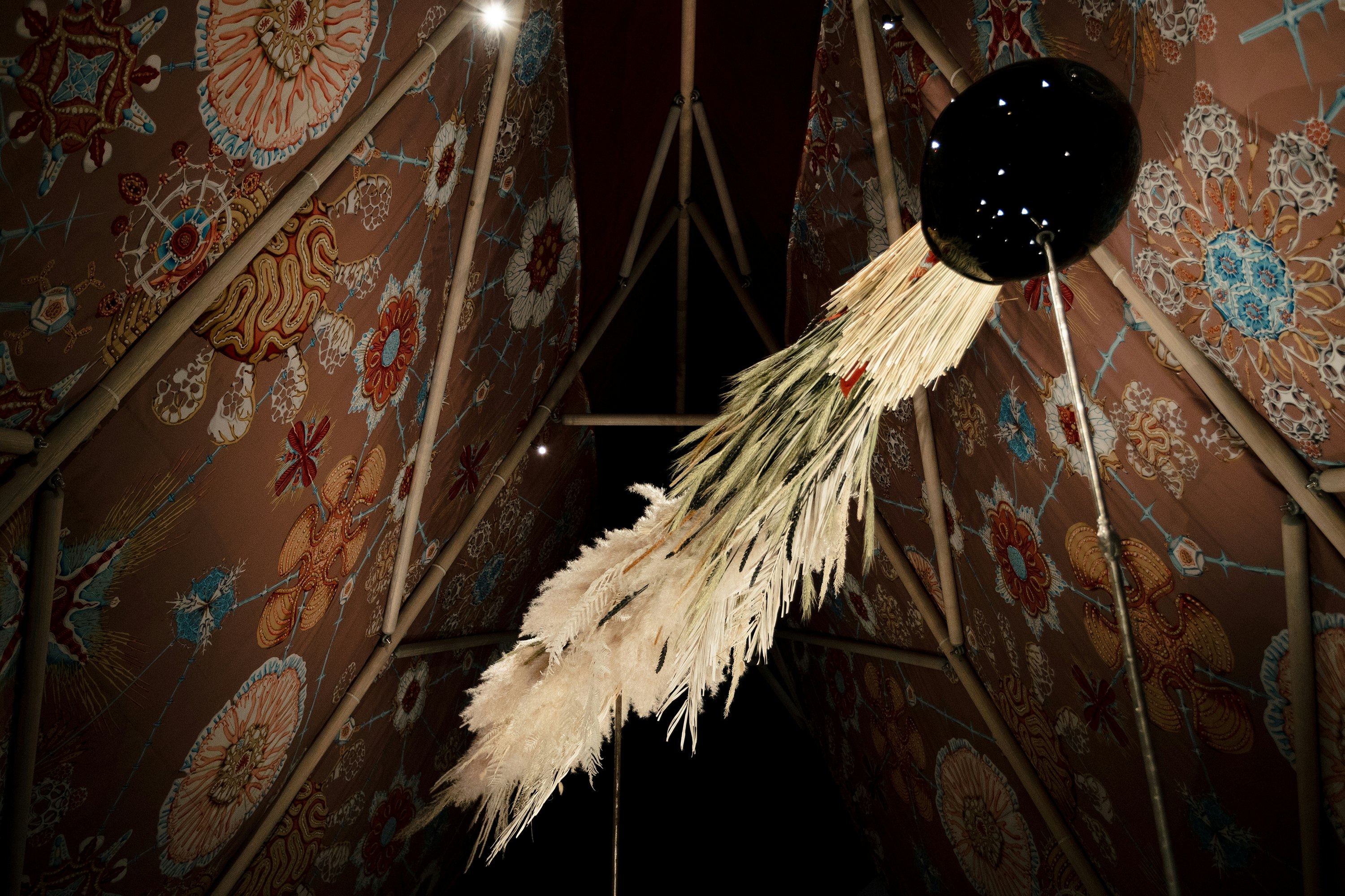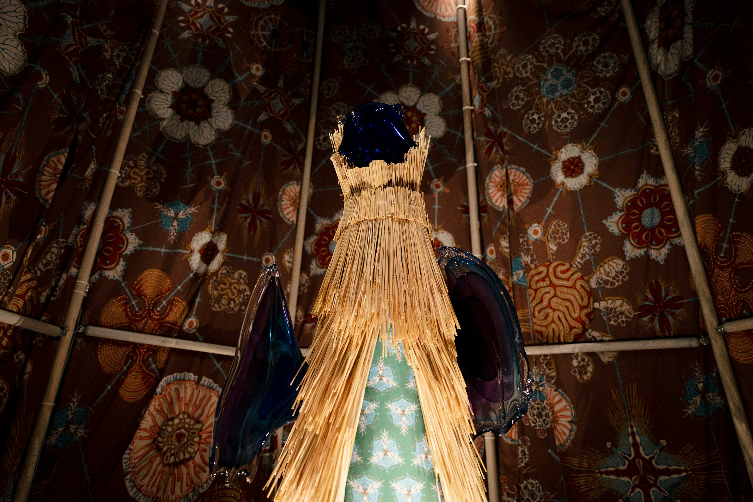 The "shingle roof" of the tents is linen, with hand-applied geometric details. The lining fabric is crepe, and it also consists of a multicolored print pattern. Inside, you can also find sculptures depicting animals, made of mouth-blown glass in Nuutajärvi, hand-made straw covering and silk fabric, on top of black charred lavers. There are a total of four mystical sculptures.