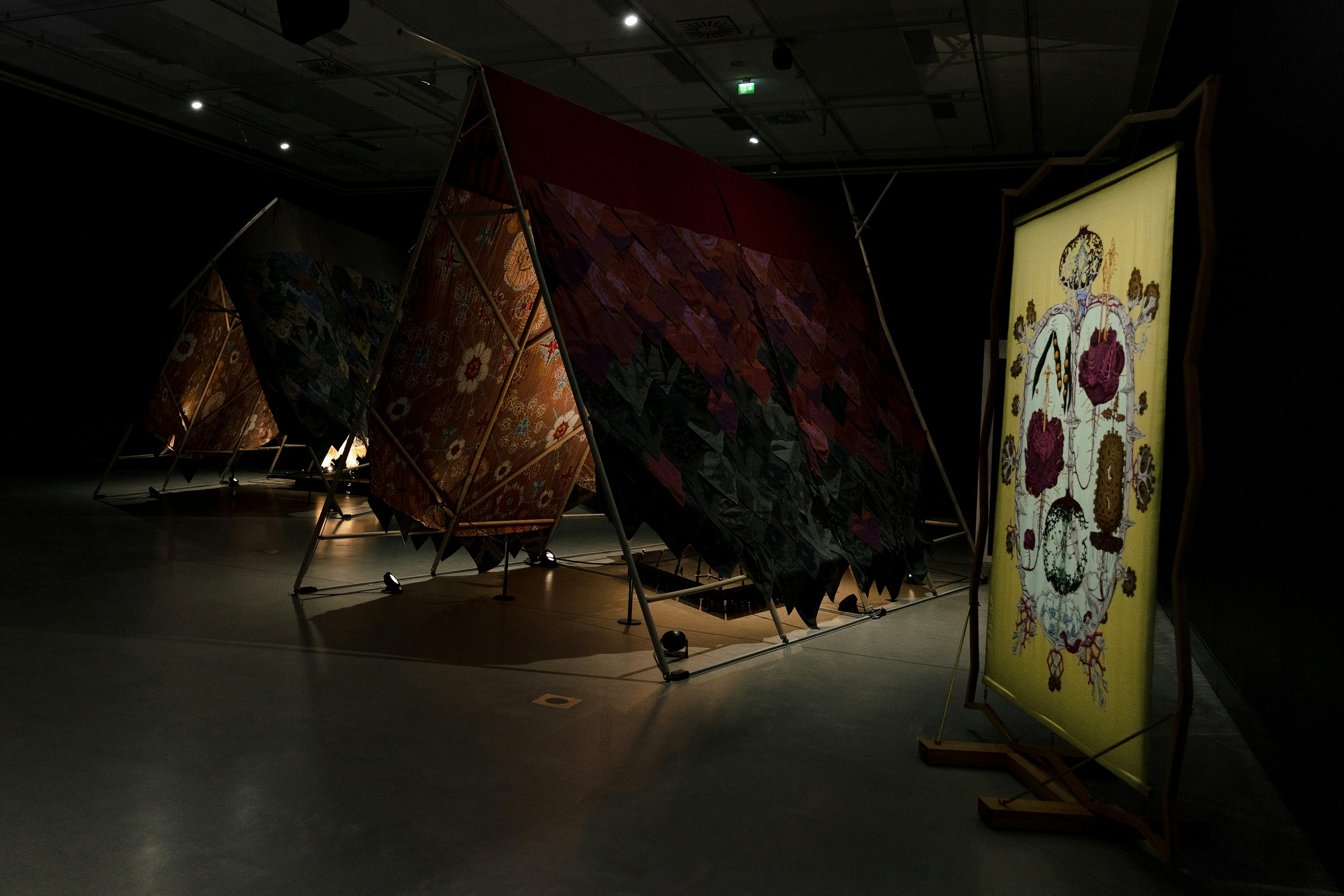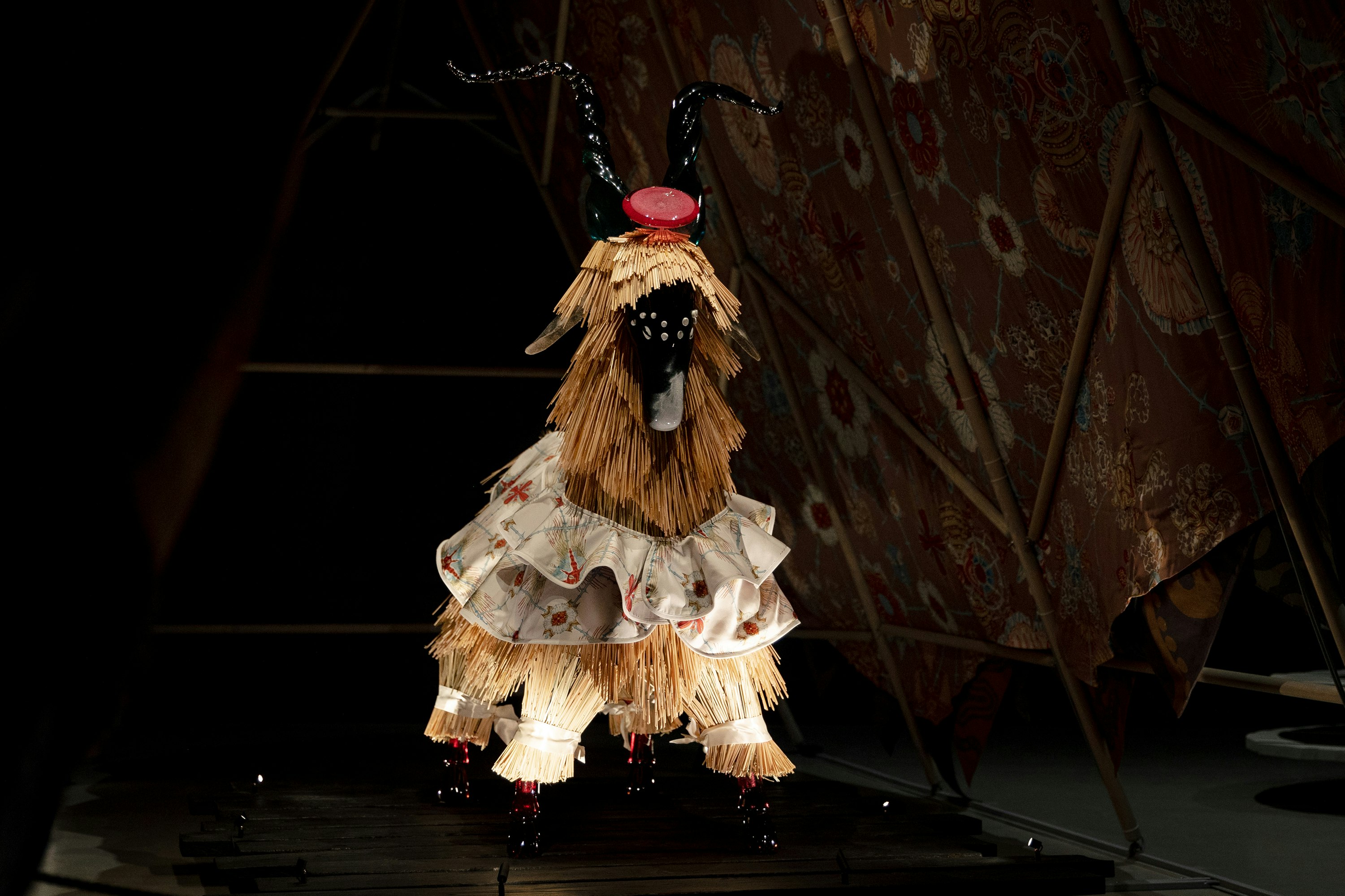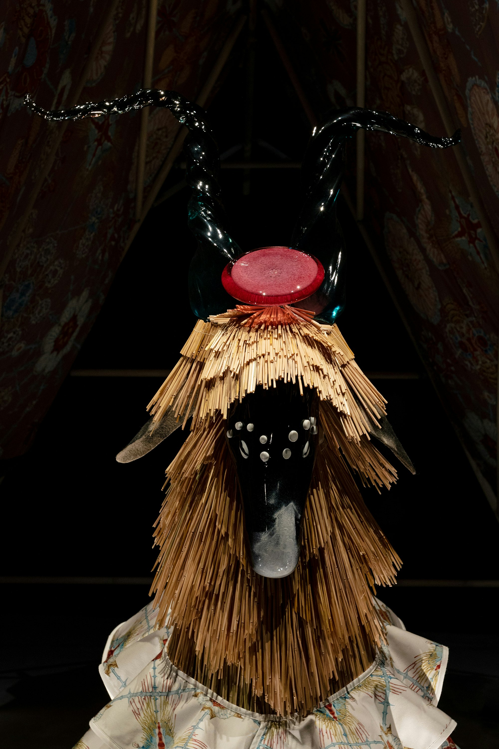 The "shingle roof" of the tents is linen, with hand-applied geometric details. The lining fabric is crepe, and it also consists of a multicolored print pattern. Inside, you can also find sculptures depicting animals, made of mouth-blown glass in Nuutajärvi, hand-made straw covering and silk fabric, on top of black charred lavers. There are a total of four mystical sculptures.