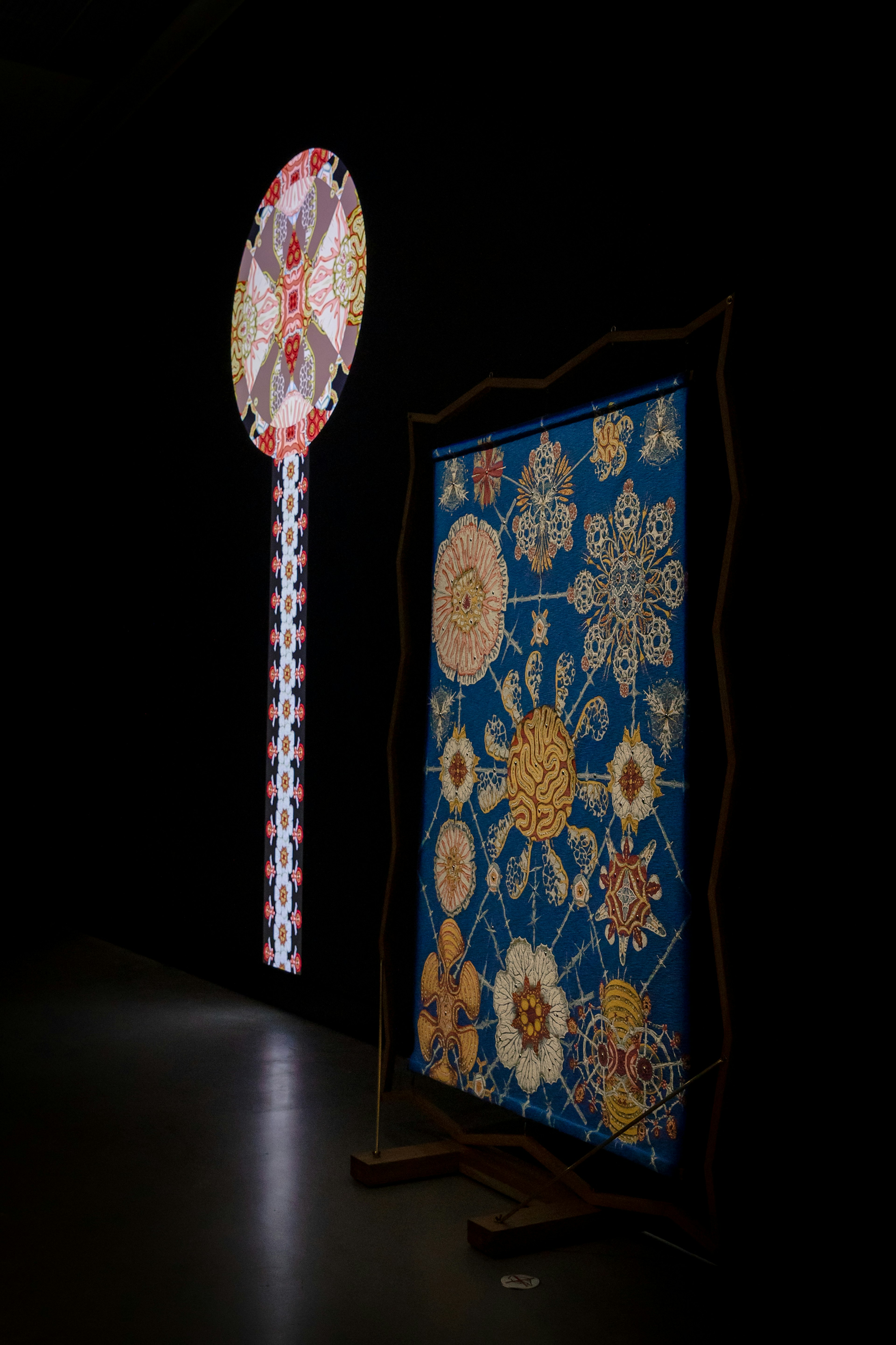 The exhibition does not open to the visitor linearly, but creates a meditative experience of overlapping, fleeting snapshots – a spontaneous synthesis of fantasy worlds and sounds.